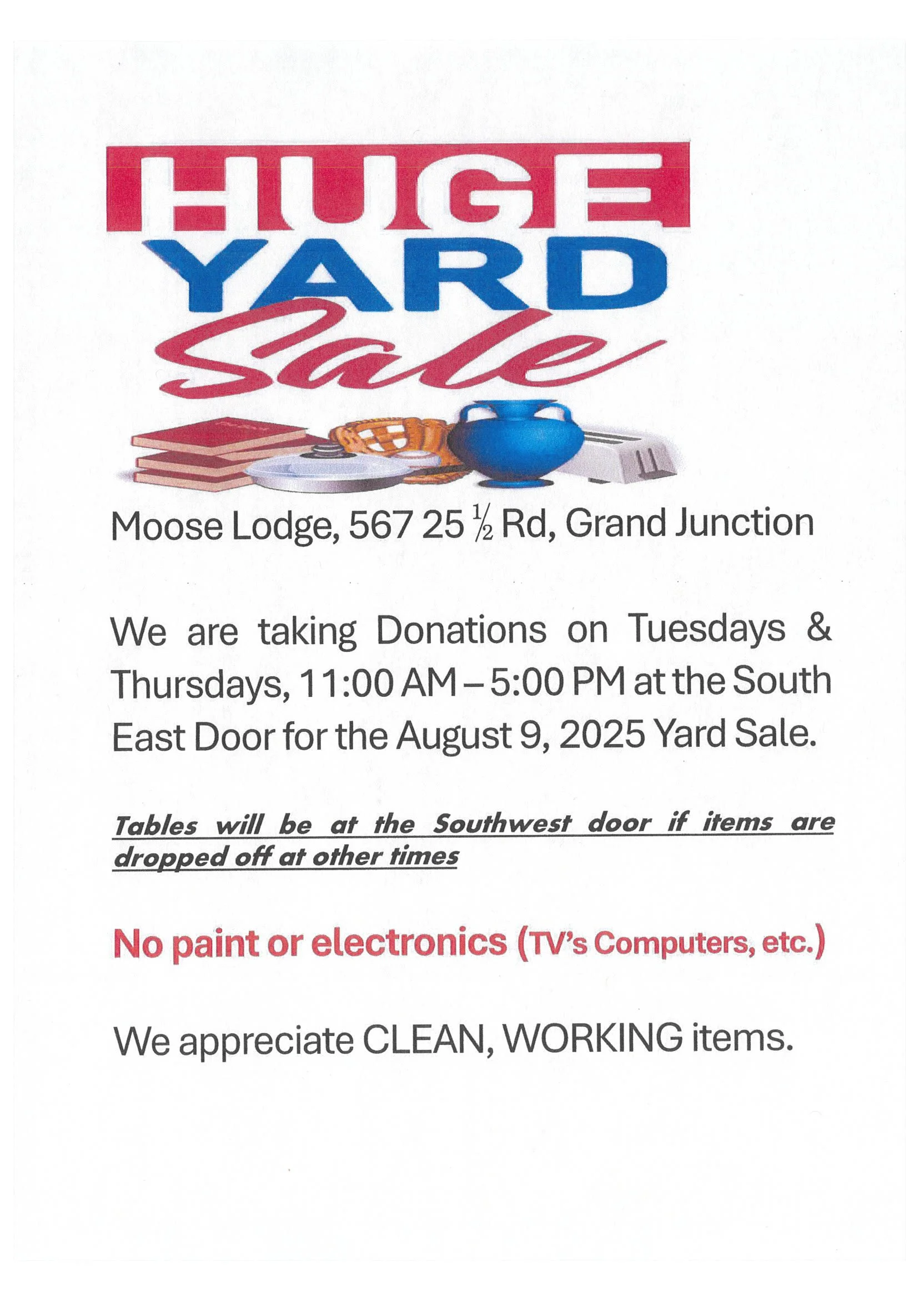 Moose Lodge Community Yard Sale Saturday, August 9, 2025 8:00 AM 2:00 PM Grand Junction Moose Lodge 270 657 25 1/2 Road Grand Junction, CO, 81505 United States (map) Google Calendar ICS
